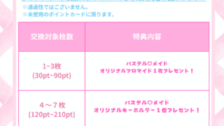 パステル♡メイド!ポイントカード!・ポイント数によって特典内容が変わります!※通過性ではございません。ポイントと交換をご希望の方はメイドにご質問ください🎀📣❕(通常通り10ptごとに1000円オプション無料券としてもご利用可能です。)